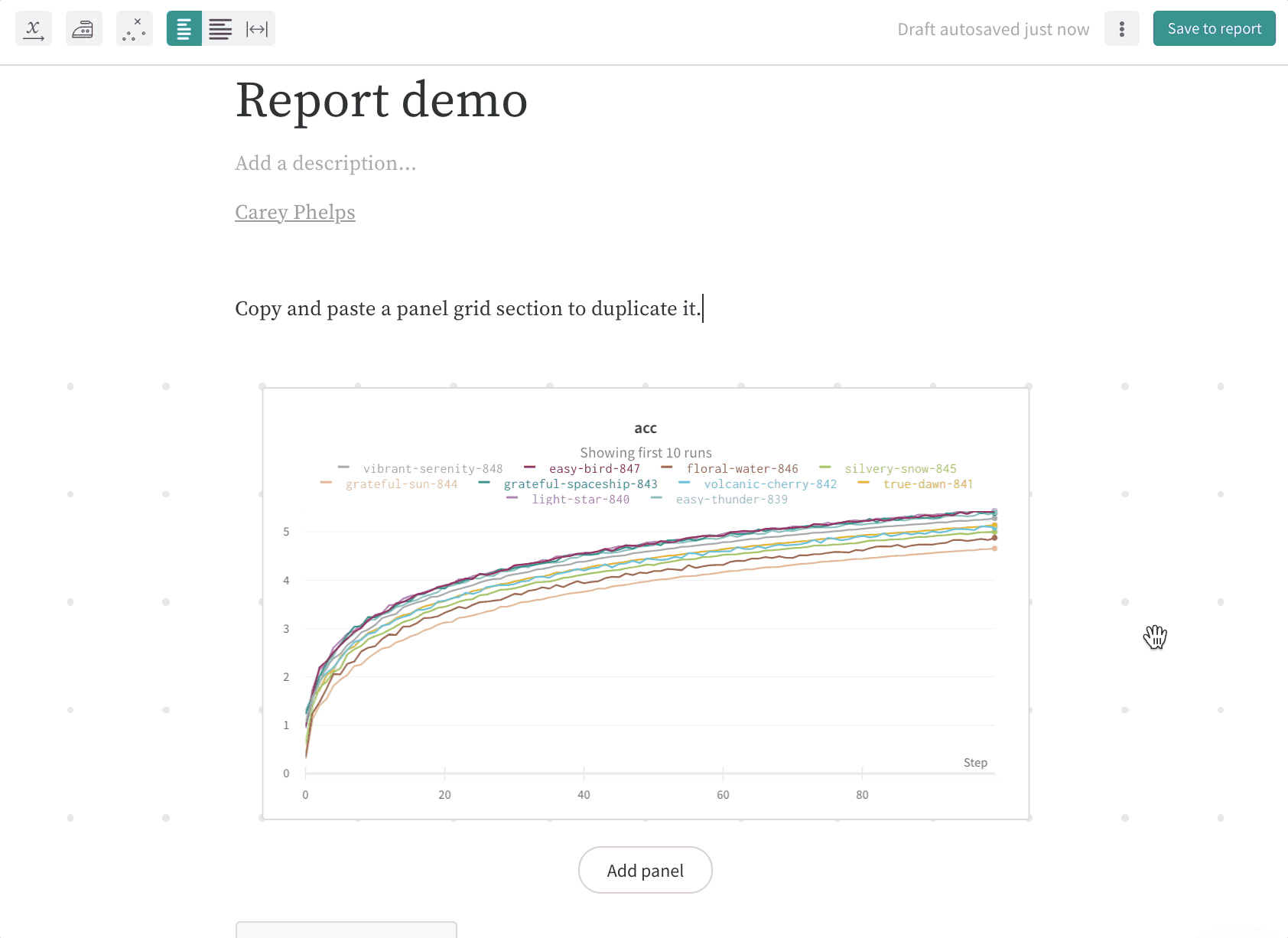 Enter a forward slash (/) in the report to display a dropdown menu. Select Add panel to add a panel. You can add any panel that is supported by W&B, including a line plot, scatter plot or parallel coordinates chart.