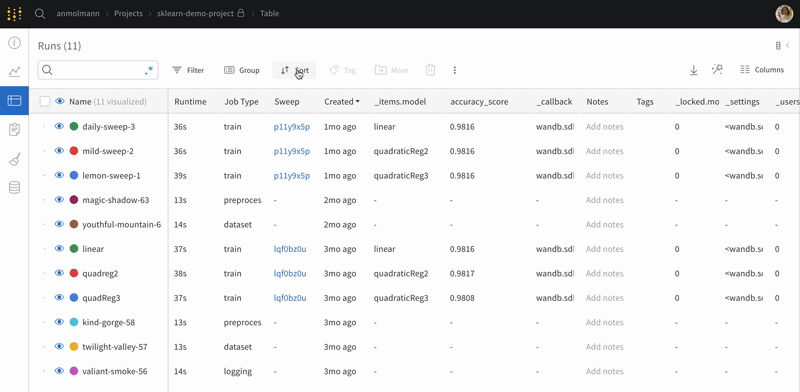 프로젝트를 동료에게 넘기거나 휴가를 가더라도, W&B는 이미 시도한 모든 모델을 쉽게 볼 수 있어서 오래된 실험을 다시 실행하는 데 시간을 낭비하지 않도록 합니다.