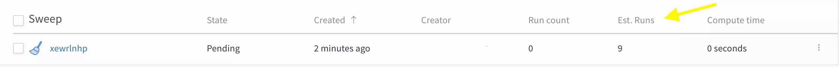 In this case, the Cartesian product equals 9. W&B displays this value in the App UI as the estimated run count (Est. Runs):