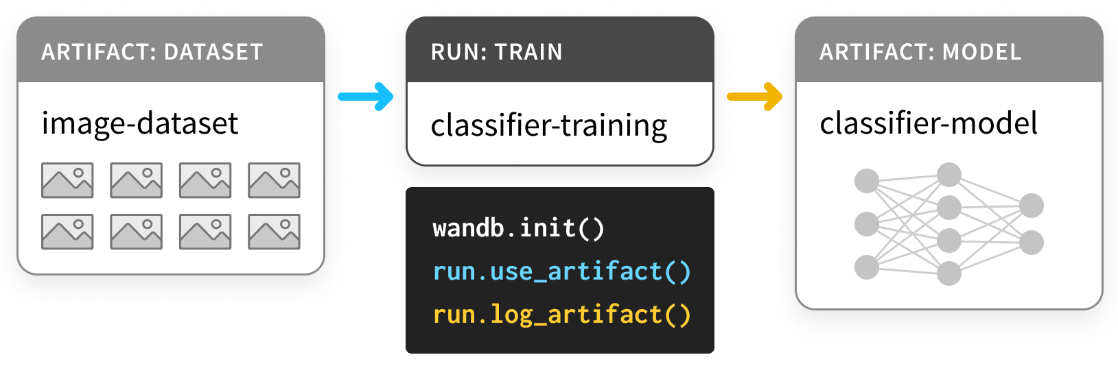 Using our Artifacts API, you can log Artifacts as outputs of W&B Runs or use Artifacts as input to Runs, as in this diagram, where a training run takes in a dataset and produces a model.